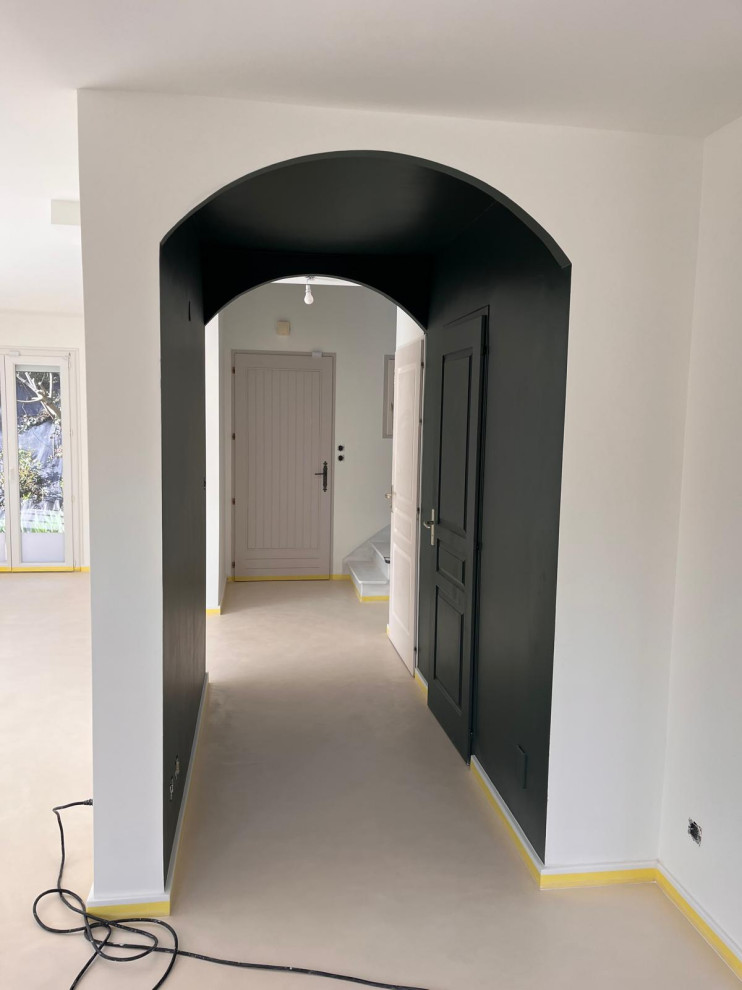 Nous avons choisi un béton ciré de teinte sable pour le sol, offrant une base élégante et contemporaine qui réchauffera l'atmosphère. Pour apporter du caractère et créer une continuité visuelle, nous allons travailler des arches qui évoqueront l'arche existante menant à la cuisine, renforçant ainsi l'harmonie architecturale de la maison.