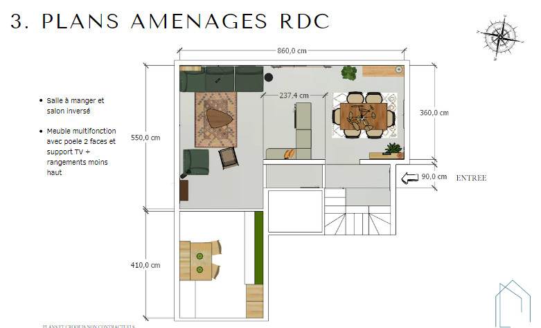 L'association de ces éléments vise à transformer la maison en un lieu accueillant et fonctionnel, où chaque espace se distingue par sa modernité tout en préservant une ambiance douce et chaleureuse.