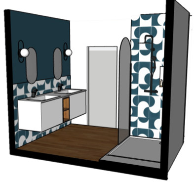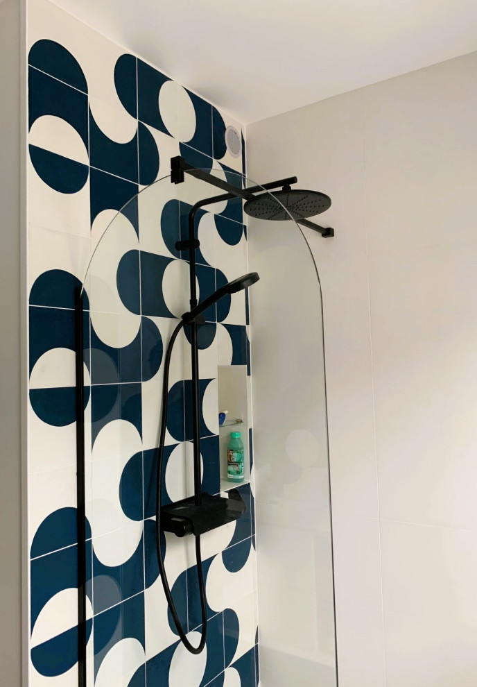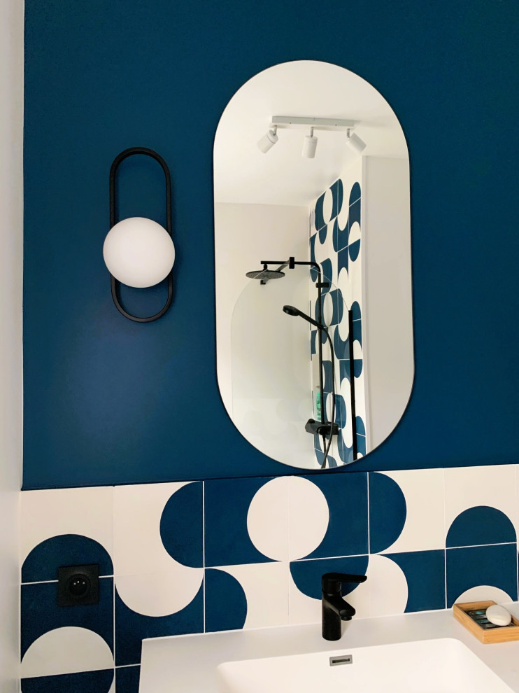 La rénovation de cette salle de bain, initialement dans son « jus » des années 70, s'inscrit dans une démarche moderne et esthétique. Les formes arrondies apportent une touche de douceur, créant une atmosphère apaisante. Les arches, harmonieusement déclinées sur les carreaux, la paroi de douche, les miroirs et les luminaires, ajoutent une dimension artistique et dynamique à l'espace. Le choix d'une palette de bleu confère à l'ensemble une élégance design.